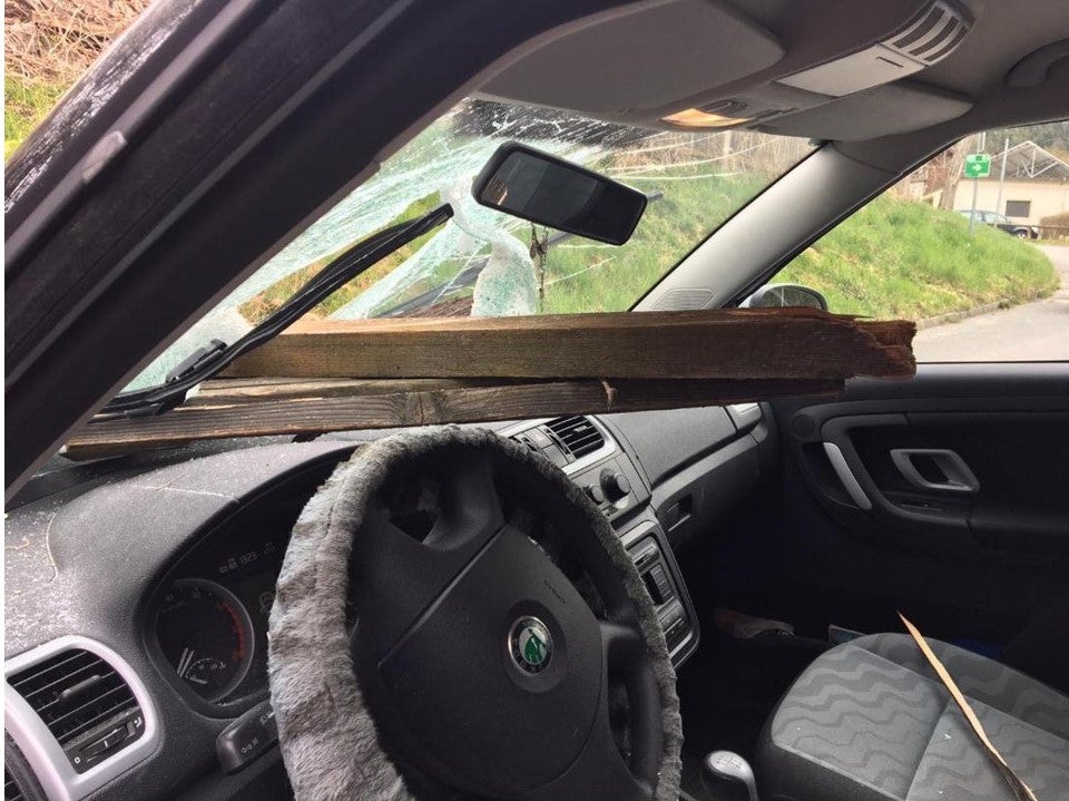 Dabei bohrte sich ein Holzpflock durch die Windschutzscheibe und verfehlte sie nur knapp. Die Frau wurde laut Feuerwehr Kapfenberg-Diemlach ins Krankenhaus gebracht.