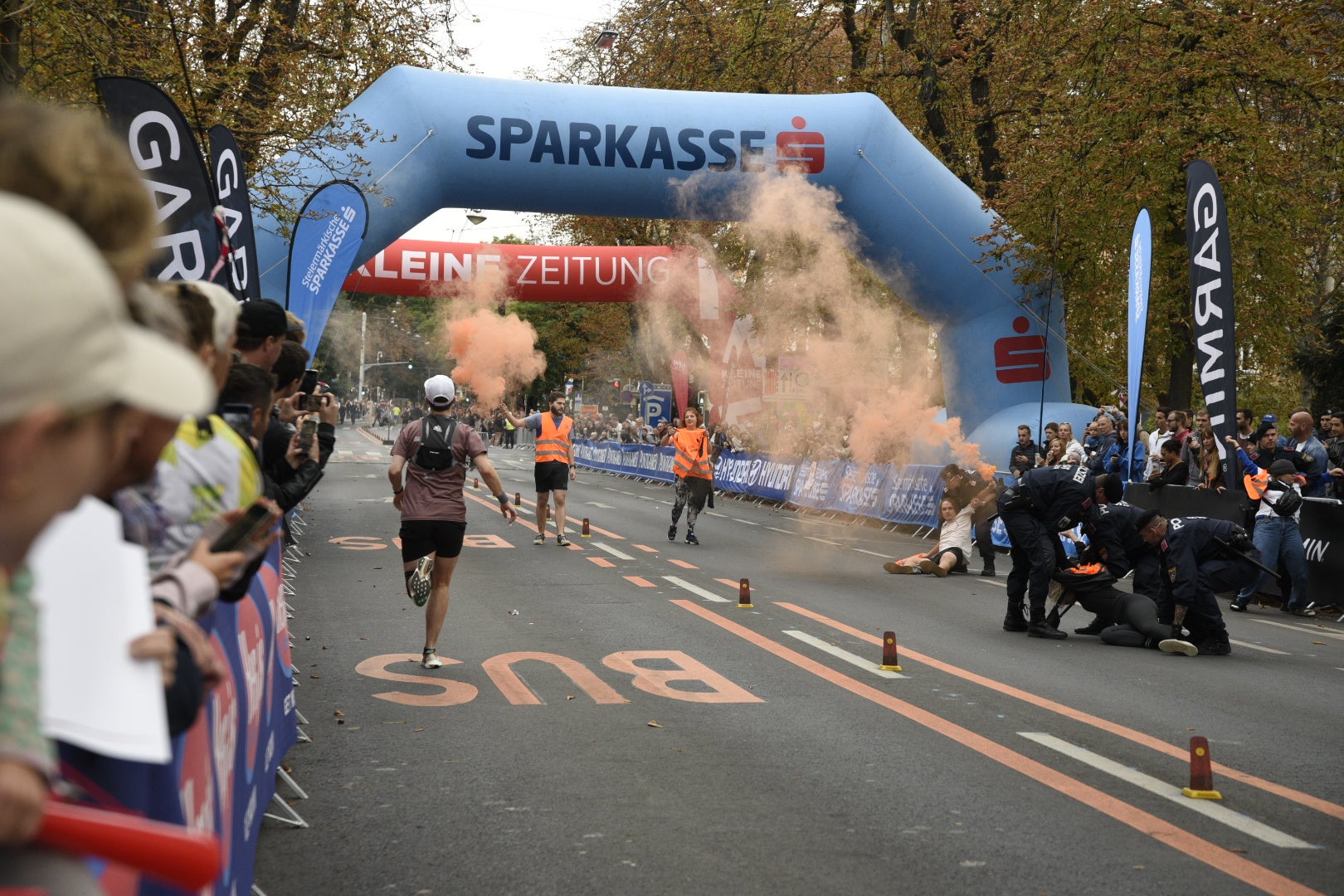 "Weil nur noch unignorierbare Proteste diese Regierung bewegen können, ihre Versprechen, ihre Ziele, geltende Verträge, Gesetze und die Verfassung einzuhalten", erklärte Sprecherin Marina Hagen-Canaval. Kurz vor dem zweiten Startblock kletterten mehrere Aktivisten über die Absperrung und zündeten orangefarbene Rauchfackeln. Die Rechtfertigung der Klima-Kleber: "Wir stören nur sehr ungern Sport und Vergnügen, es ist jedoch angesichts der gravierenden gesundheitlichen Gefahren der Klimazerstörung notwendig."