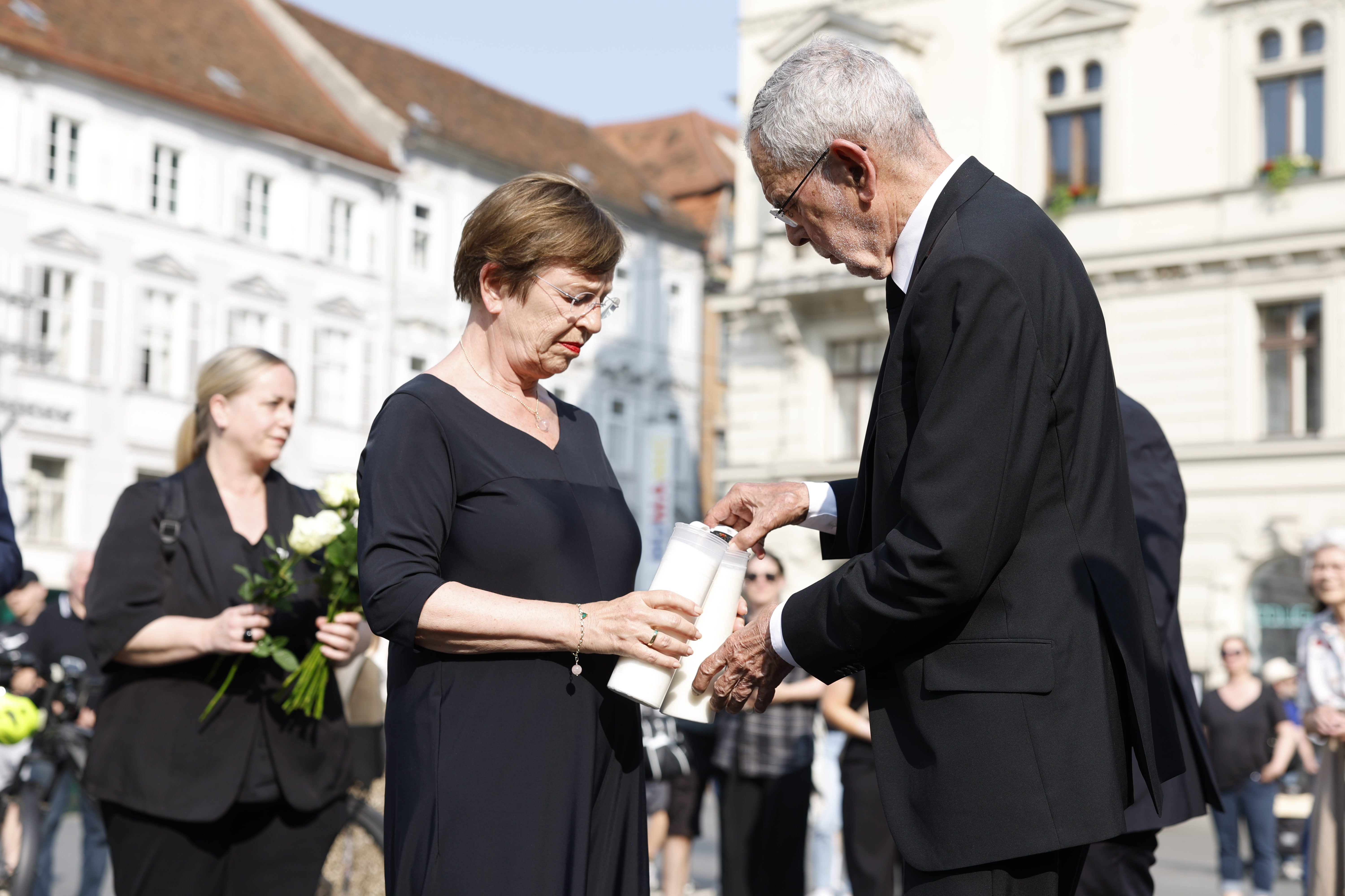 Zuvor war er für Gespräche bei Landeshauptmann Mario Kunasek (FPÖ) in der Grazer Burg und bei Bürgermeisterin Elke Kahr (KPÖ) im Rathaus. "Der Schock über die toten Kinder und Jugendlichen sitzt ganz, ganz tief", sagte Van der Bellen am Hauptplatz gegenüber Medien.