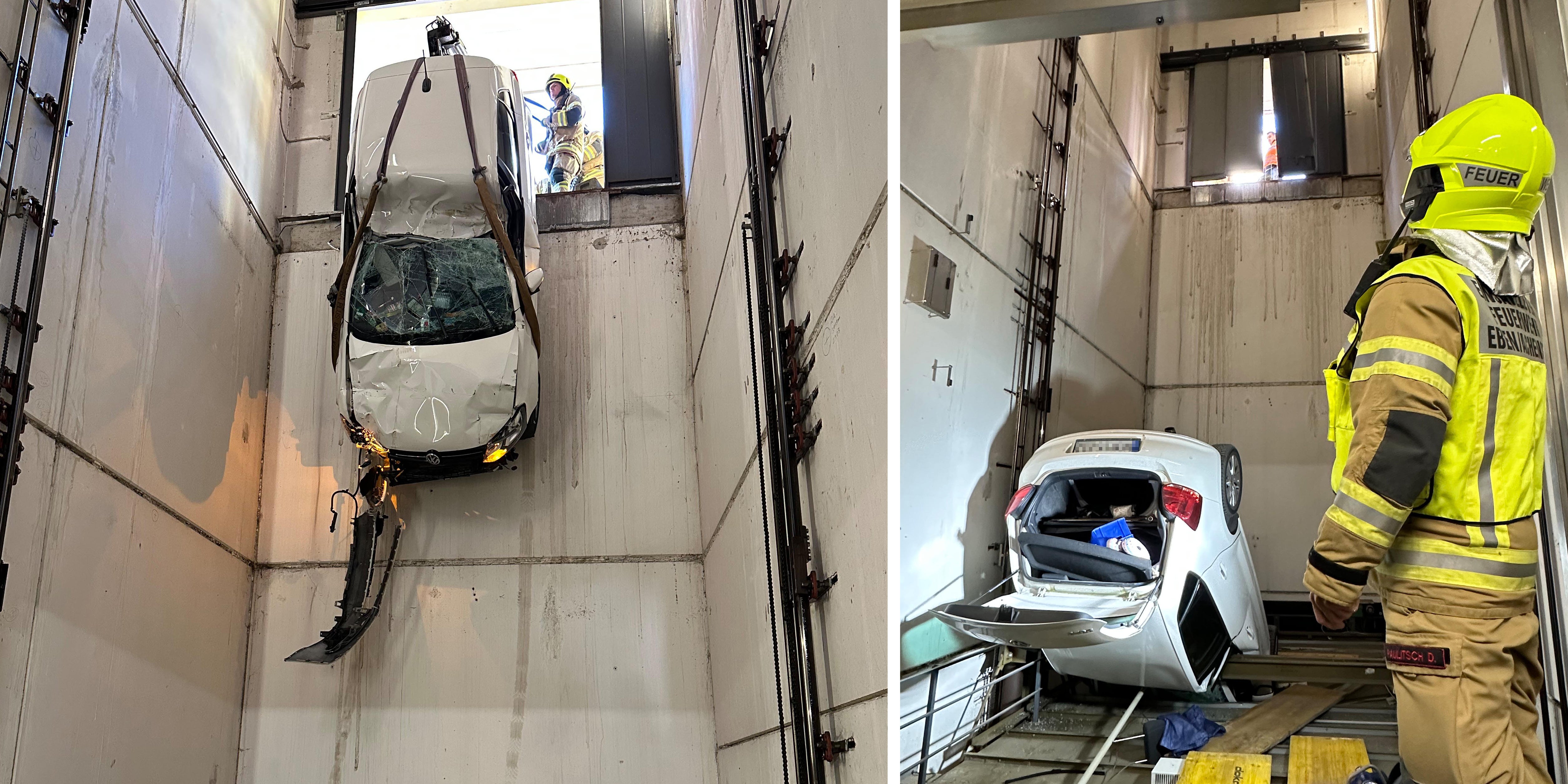 Der Hausmeister durchbrach kurz vor Mittag die Tür zu dem Aufzug, mit dem die Autos in die Tiefgarage gebracht werden. Das Fahrzeug krachte im freien Fall nach unten, der Lenker soll bei der Bergung aber ansprechbar gewesen sein.
