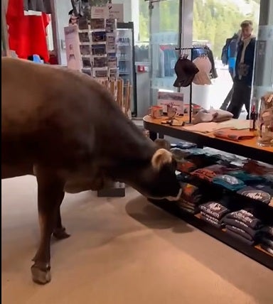 Ungewöhnlicher Besuch im Tiroler Stubaital. Am Donnerstag spazierte um die Mittagszeit plötzlich eine Kuh in ein Sportartikelgeschäft in der Talstation der Stubaier Gletscherbahn.