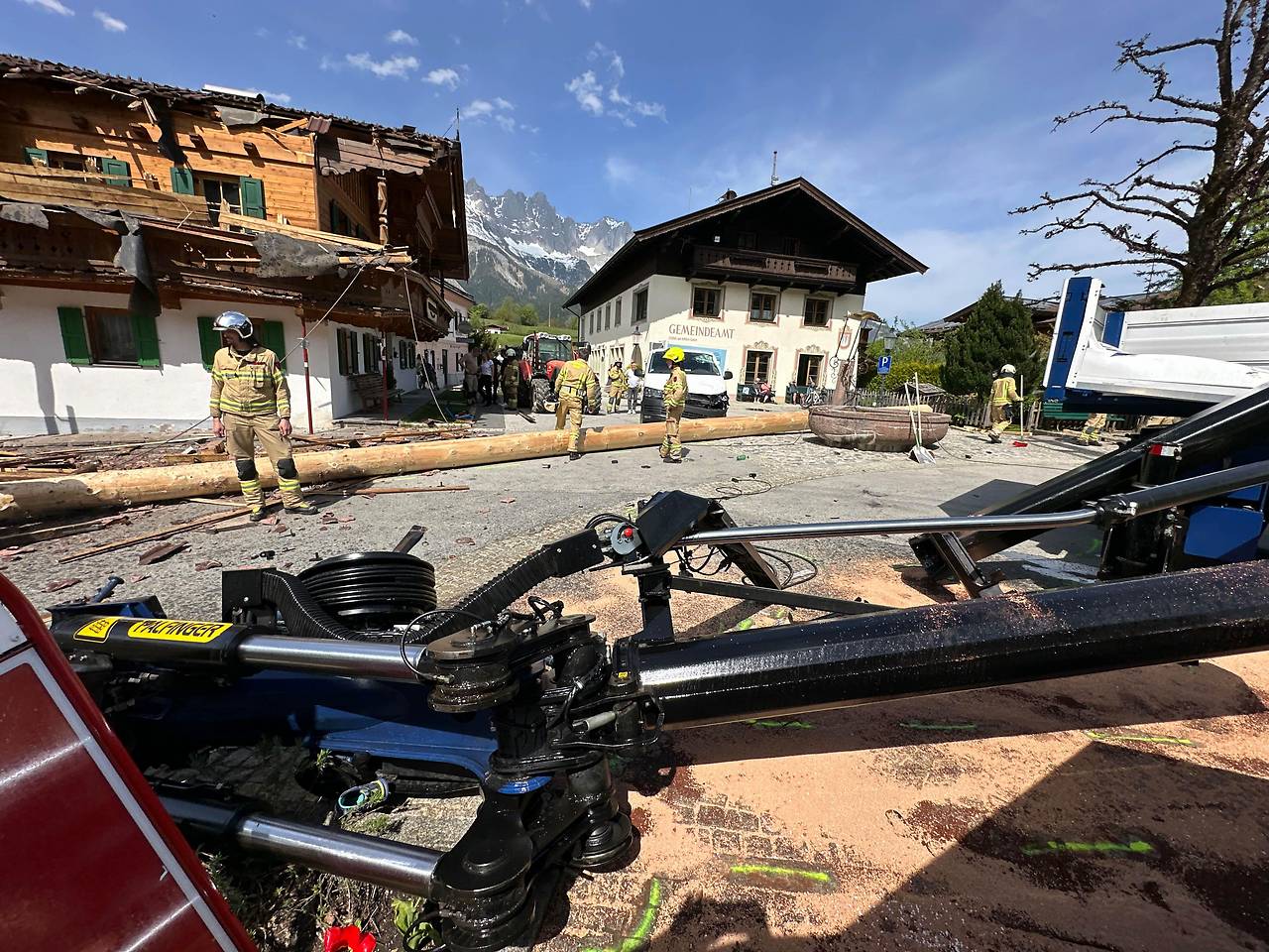 Beide wurden erheblich beschädigt. Der Siebenjährige wurde mit dem Notarzthubschrauber in die Innsbrucker Klinik geflogen. Er wurde schwer am Fuß sowie im Gesicht verletzt, war aber ansprechbar und befand sich nicht in Lebensgefahr, hieß es. Das vom 30 bis 40 Meter hohen Maibaum getroffene Privathaus soll als Gasthaus aus der Fernsehserie "Der Bergdoktor" bekannt sein, berichtete der ORF Tirol. In dem Haus wohnen laut dem Bürgermeister der Gemeinde zwei Menschen. Diese wurden nicht verletzt.