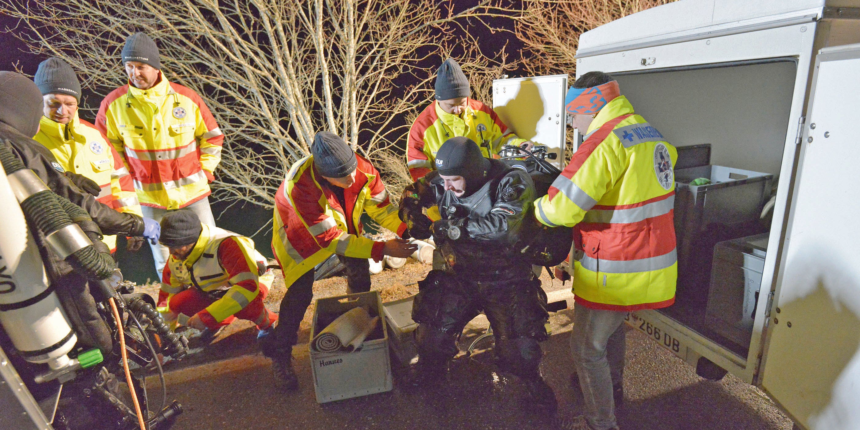 Bergung. Mit einem vorbeifahrenden Mann gemeinsam alarmierte sie die Einsatzkräfte. Wegen der schlechten Sichtverhältnisse wollten die Rettungskräfte das Auto am nächsten Morgen herausziehen. Spezialtaucher konnten den Wagen aber erst am Nachmittag orten und mit Stahlseilen sichern. Mithilfe von Hebeballons konnte das Unfallfahrzeug, an dem Totalschaden entstanden war, geborgen werden.