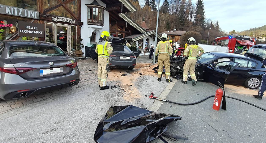 Bei einem Verkehrsunfall auf der B161 Pass Thurn Straße in Kitzbühel wurden gestern, Samstag, sieben Personen zum Teil schwer verletzt.