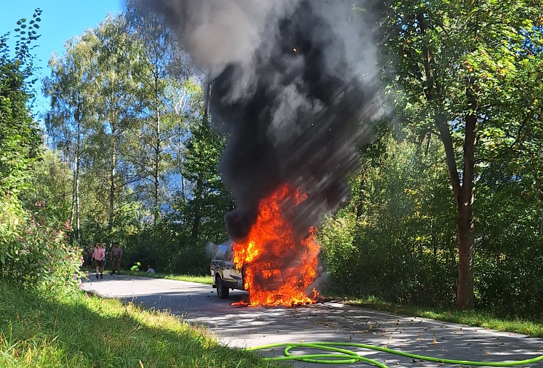 Nach dem Zusammenprall fing das Motorrad unter dem PKW Feuer, und die Flammen griffen schnell auf den Wagen über. Der österreichische Fahrer konnte den Viehanhänger, in dem sich zwei Kühe befanden, rechtzeitig abkuppeln und so verhindern, dass die Tiere in Gefahr geraten.