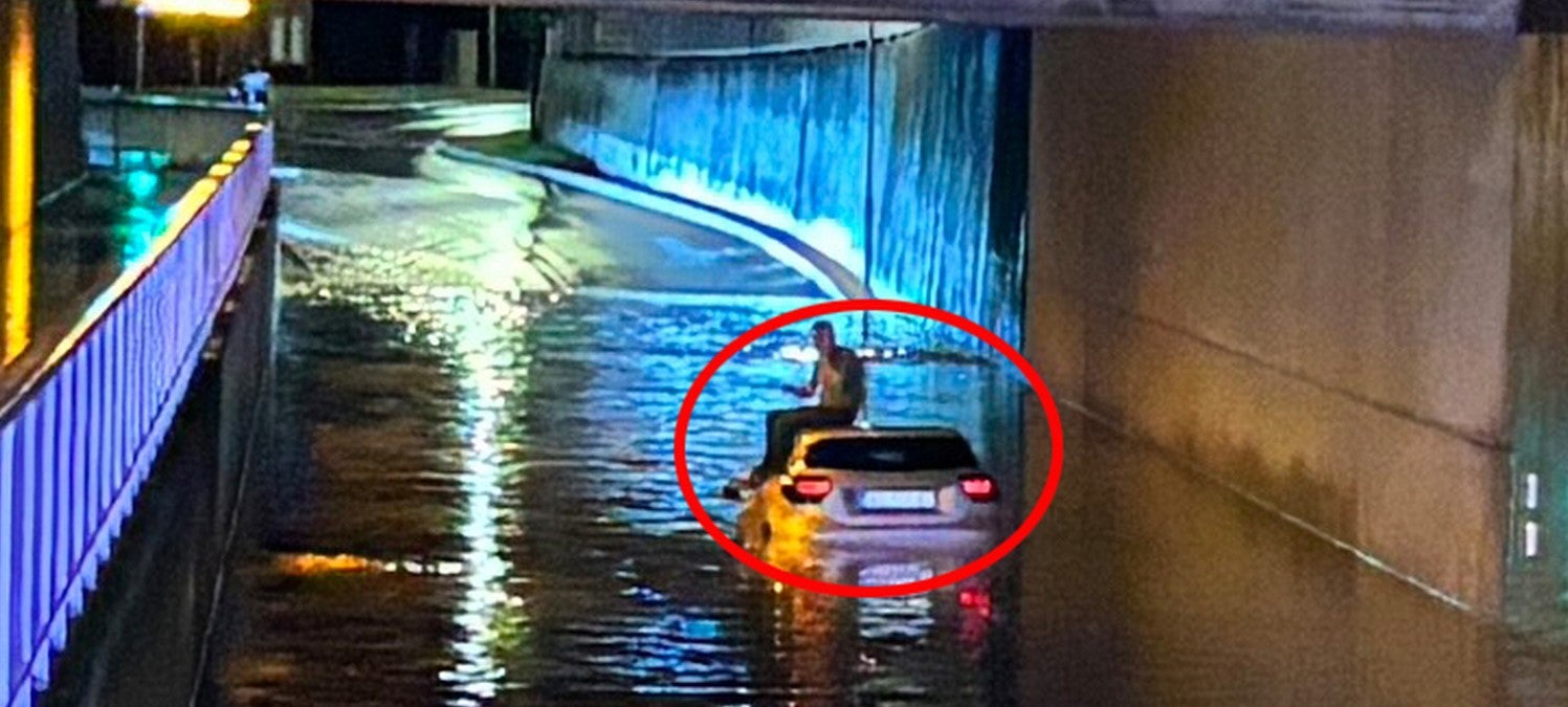 Denn gegen 20.25 Uhr ging seine silberne A-Klasse bei der Durchfahrt in den Wassermassen fast komplett unter. Der Fahrer schaffte es sich selbst aus dem Fahrzeug befreien und aufs Dach des Autos flüchten.