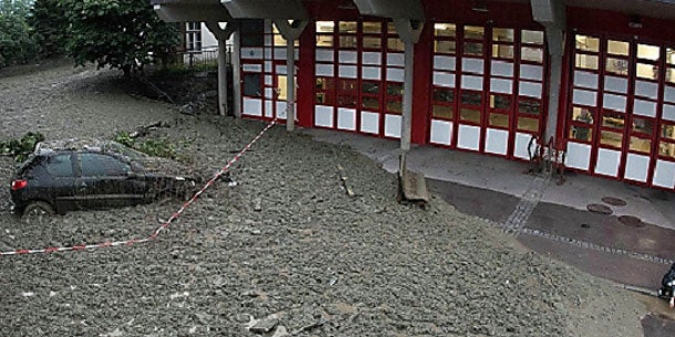 EIn Video zeigt nun, wie von der Mure Steine mitgerissen werden und mit welcher Geschwindigkeit sich Hochwasser und Schlamm mitten durch den Ort bewegen.