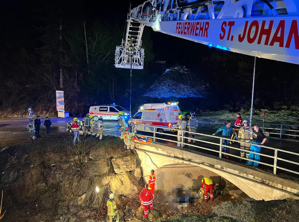 Kurz nach 0.30 Uhr wurde bei der Polizei ein Sturz einer Person von einer Brücke angezeigt. Bei der sofort eingeleiteten Nachschau wurden die beiden Frauen entdeckt und nach der Erstversorgung ins Krankenhaus nach St. Johann gebracht. Die Feuerwehr stand mit 40 Personen im Einsatz.