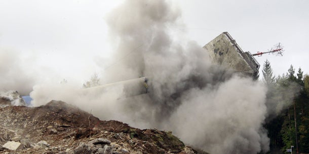 Mit einem weithin hörbaren Knall ist am Freitag die 44 Jahre andauernde Geschichte des alten Aussichtsturms am Pyramidenkogel in der Gemeinde Keutschach (Bezirk Klagenfurt Land) in Kärnten zu Ende gegangen. Knapp nach 12.00 Uhr zündete Sprengmeister Franz Schuster rund 40 Kilogramm Sprengstoff, die das 54 Meter hohe Bauwerk zu Fall brachten. An der Stelle wird nun ein 100 Meter hoher Holzturm entstehen.