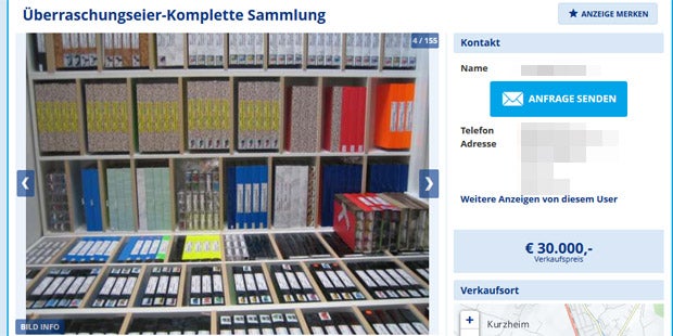 Ein Obersteirer will die möglicherweise größte Überraschungseier-Figurensammlung Österreichs verkaufen: Der Trofaiacher hat rund 15 Jahre lang gesammelt und Tausende Figuren penibel in Kassetten verwahrt. Die dazugehörenden Beipackzettel füllen 62 Ordner, teilte das Kleinanzeigenportal willhaben.at via Aussendung mit. Der Sammler will zumindest 30.000 Euro für seine Sammlung.