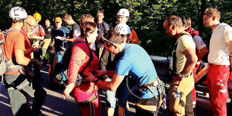 Auf der anderen Seite war eine vierköpfige Familie aus Indien, die von herabfallenden Steinen getroffen und leicht verletzt wurde. Sie schaffte es zurück zum Eingang, wo sie versorgt wurde. Wahre Helden waren die Bergretter aus der Umgebung, die einen Notsteig errichteten. Sie statteten die Eingeschlossenen mit Helmen und Gurtzeug aus und begleiteten sie einzeln zur Landstraße. Alle Personen blieben unverletzt.