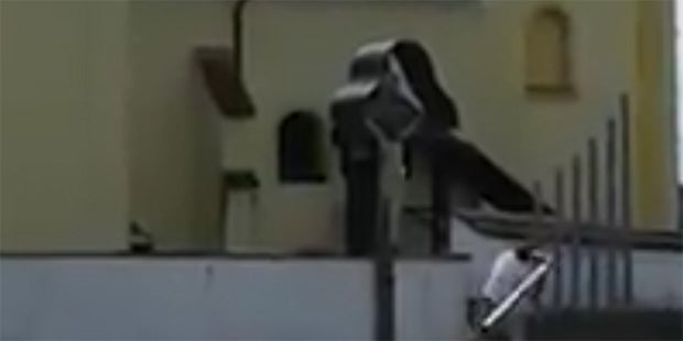 Der Unbekannte ist zu sehen, wie er mit Steinen und einer Holzlatte auf den lebensgroßen Jesus in der Pfarre St. Marein los geht. Mit voller Wucht drischt er auf den Kopf der Jesusfigur ein, als diese nicht kaputt geht, wirft er die Holzlatte von sich.