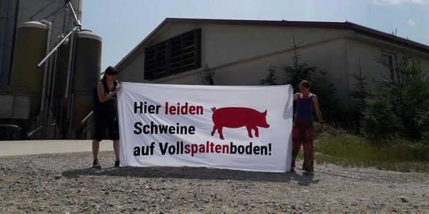 Am Donnerstag demonstrierten mehrere Mitglieder des Vereins gegen Tierfabriken (VGT) vor drei niederösterreichischen Schweinefabriken gegen sogenannte Vollspaltböden. "Dem Verein wurden Bilder zugespielt, die zeigen blutige Tiere mit abgebissenen Ohren und Schwänzen auf völlig verdreckten Halteböden zeigen", heißt es in einer VGT-Aussendung.