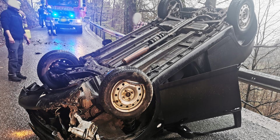 Der Wagen prallte gegen herabfallendes Gestein und landete auf dem Dach.