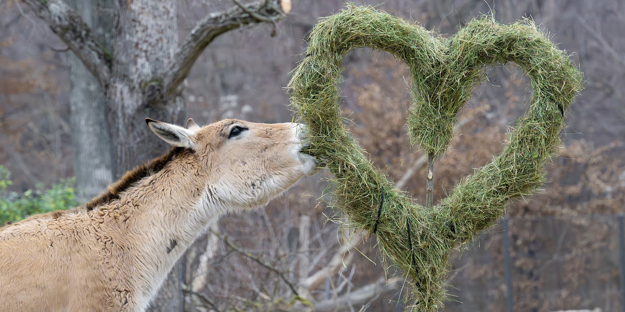 Ein Hauch von Valentinstagsromantik hielt bei den genügsamen Steppenbewohnern bereits Einzug - mit einem Herz aus Heu. Die Pflanzenfresser, die sich vor allem von harten Gräsern und Kräutern ernähren, haben die Überraschung prompt verdrückt.