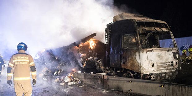 Nach einem Reifenplatzer touchierte der Lastwagen die Leitplanke und ging in Flammen auf.