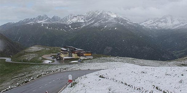 Auch die Radprofis kämpfen bei der Österreich-Rundfahrt gegen das Wetter. Auf der vierten Etappe geht es über den Felbertauern, die Biker sind beim Matreier Tauernhaus (1.512 Meter Seehöhe) mit Regenjacken unterwegs.