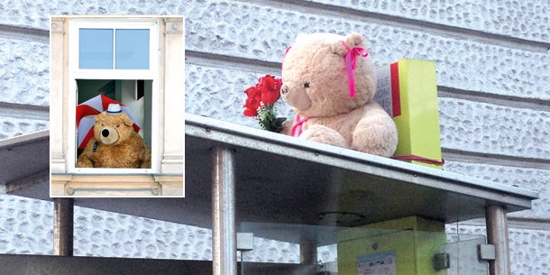 Es ist die bärigste Liebe des Sommers. Der Fensterbär vom Sechshauser Gürtel und eine kleine Bärendame. Seit Mittwoch sitzt sie auf einer Telefonzelle gegenüber der Bären-WG. Mit einem Strauß Rosen in der Tatze schmachtet sie zum Fenster – doch der Gürtelbär ist fort.