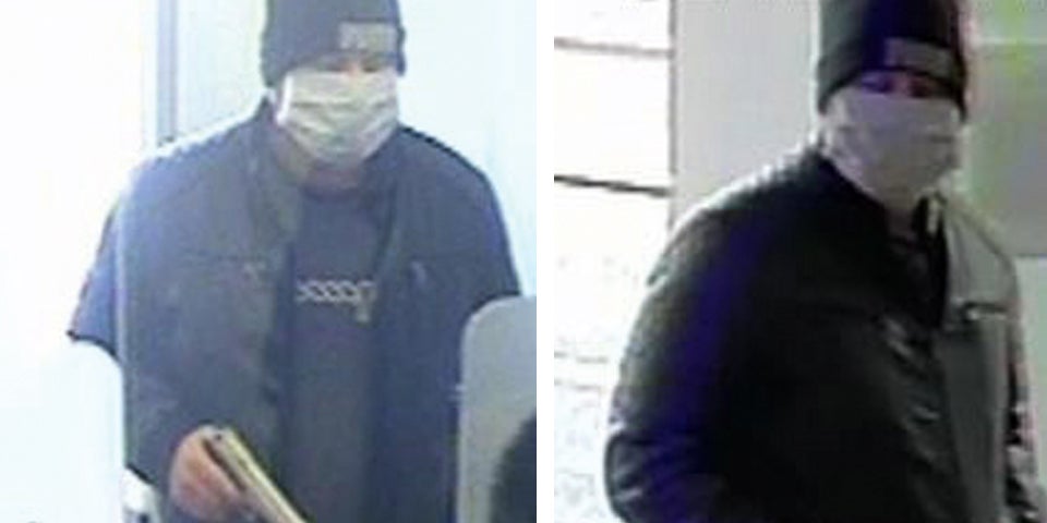Mit Fahndungsfotos jagt die Polizei einen Bankräuber mit Corona-Maske.