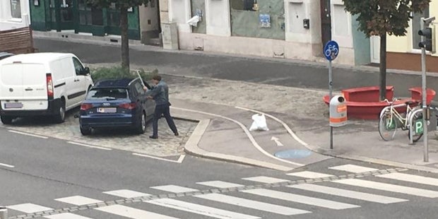 Die Beamten fanden ein zerstörtes Auto und eine Eisenstange dahinter. Zeugen sagten den Polizisten, dass der Mann, der für den Schaden verantwortlich war, sich in Richtung stadteinwärts abgesetzt hatte und dass er ein Messer bei sich hatte. Auf der Kreuzung Ramperstorffergasse-Stolberggasse stellten ihn die Polizisten. Er stand zunächst regungslos auf dem Gehsteig und hielt das Messer in seiner rechten Hand.