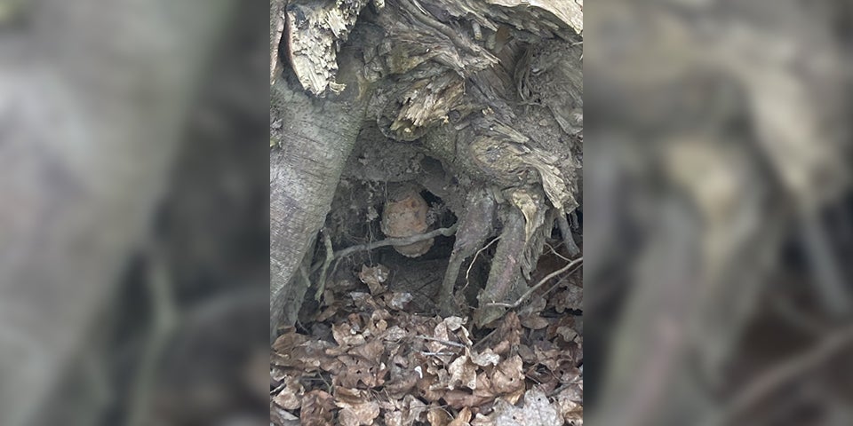 Das Kriegsrelikt war mit Baumwurzeln verwachsen.