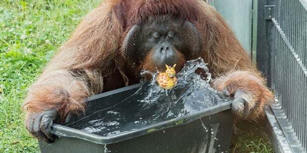 Orang-Utans sind wasserscheu, spielen jetzt aber gerne mit dem kühlen Nass.