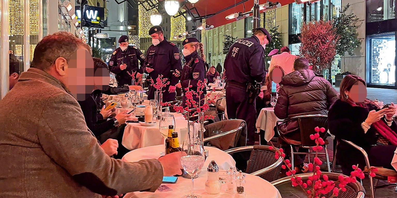 Das staunten die Gäste im Schwarzen Kameel, als eine Sondereinheit der Polizei mit acht Einsatzkräften Montagabend gegen 19 Uhr anrückte und nicht nur den Schanigarten, sondern auch den Innenbereich des Lokales auf 2G kontrollierte: