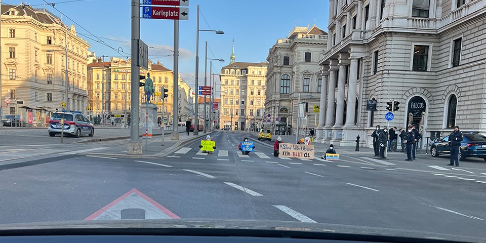 Aus Protest gegen den Krieg in der Ukraine und dass immer noch Öl und Gas aus Russland nach Österreich importiert werden, hat eine Handvoll Aktivisten von #StandWithUkraine Austria Montagfrüh die Kreuzung Schwarzenbergplatz/Lothringerstraße blockiert. Nach gutem Zureden der Beamten zogen die Teilnehmer wieder ab, berichtete Polizeisprecher Daniel Fürst.