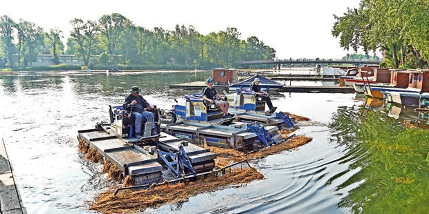 „Wir werden am Ende des Jahres voraussichtlich zwischen 3.000 und 4.000 Tonnen Makrophyten entfernt haben“, erklärt Gerald Loew von der MA 45. Seit Juni wurde in zwei Schichten von 6 bis 23 Uhr gemäht. Mit den 17 Booten, die in zweieinhalb Meter Tiefe schneiden.