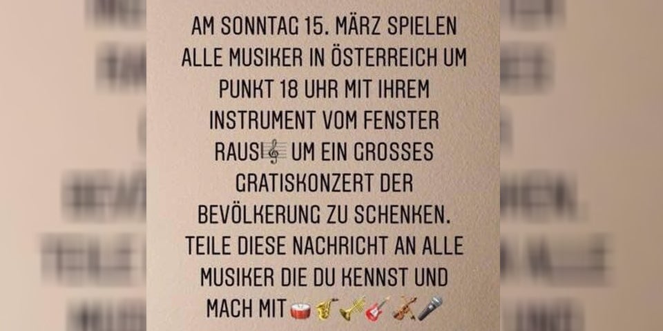 Nachdem in Rom angesichts des Coronavirus viele Italiener immer wieder an Fenstern und auf Balkonen gemeinsame Konzerte veranstaltet haben, haben auch österreichische Musiker via sozialer Medien zu einem "Flashmob-Gig" am Sonntag aufgerufen. Dabei sollen Musiker um Punkt 18.00 Uhr mit ihren Instrumenten vom Fenster hinaus spielen, "um der Bevölkerung ein großes Gratiskonzert zu schenken", hieß es.