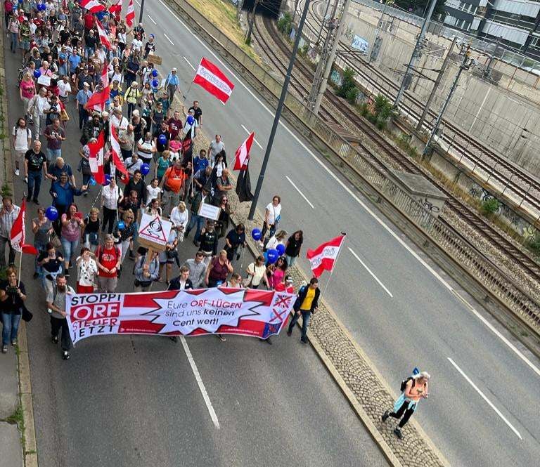 Am Samstag rief das Bündnis "direktdemokratisch.jetzt" zur Demonstration vor dem ORF-Zentrum. An die 200 Menschen aus rechten Gruppierungen versammelten sich gegen Mittag in Meidling, um anschließend gemeinsam zum Küniglberg zu marschieren.