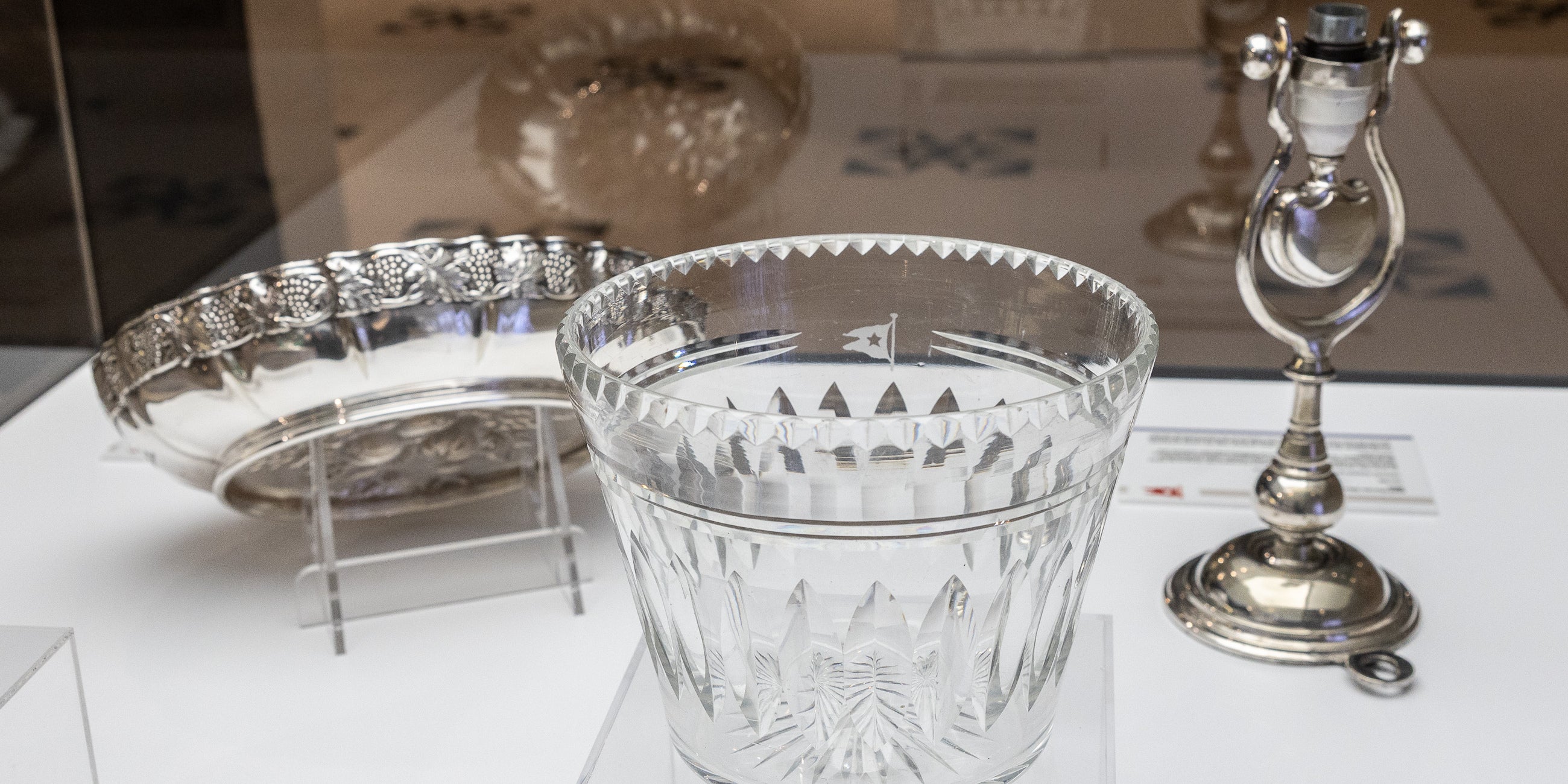 Auch ein exklusives Tafelwasser-Service ergänzt die Ausstellung. Silberne Halterungen hielten einst torpedoförmige Flaschen sicher am Tisch. Das Eisberg-Relief auf dem ausgestellten Stück sollte ursprünglich Reinheit symbolisieren und wirkt heute wie eine düstere Vorahnung.