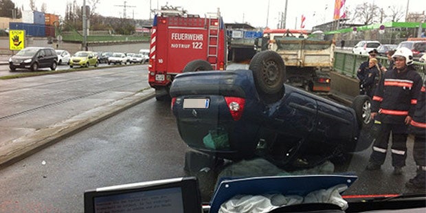 Crash mit Lkw bei Tunneleinfahrt zur A23 - Pkw landete auf dem Dach.