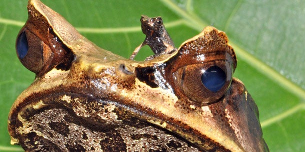 Beim Zipfelkrötenfrosch, einem Bodenbewohner der Regenwälder Borneos, war jahrelange Arbeit und Erforschung der Fortpflanzungsbiologie erforderlich, weshalb man sich besonders über die gelungene Nachzucht freut. Die handgroße Amphibie ist ein Meister der Tarnung. Sie ist durch Färbung und die Hautzipfel an Nase und Augenlidern zwischen den braunen Blättern des Waldbodens beinahe unsichtbar.