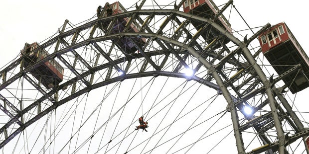 Die Höhenrettung der Feuerwehr, die Seiltechnikgruppe der Wiener Berufsrettung und Spezialisten der Wega haben Mittwochfrüh eine spezielle Einsatzannahme geübt: die Personenbergung aus Gondeln am höchsten Punkt des Wiener Riesenrads. Insgesamt 44 Einsatzkräfte kletterten dazu von außen auf das stillstehende Wahrzeichen und seilten sich bei Wind und Regen ab.