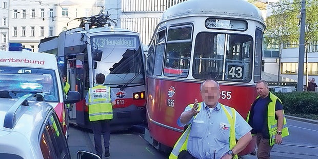 Ein spektakulärer Crash zweier entgegenkommender Straßenbahnen der Linie 43 forderte am Dienstagnachmittag zwölf Verletzte. Sie wurden von der Berufsrettung – die mit fünf Fahrzeugen und 15 Helfern vor Ort waren – ins AKH und ins Wilhelminenspital gebracht. Die meisten hatten Abschürfungen und Prellungen, zu schwereren Verletzungen wie etwa Brüchen kam es zum Glück nicht.