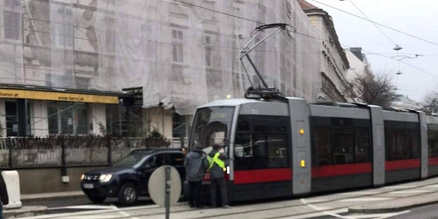 Die Bilder zeigen das Auto auf der Seite eingebeult. Auf der viel-befahrenen Straße, zwischen Westbahnhof und der Schlossalle bis hin zum Gürtel kam es zu Fahrtbehinderungen und einen Zeitverlust von ein paar Minuten.