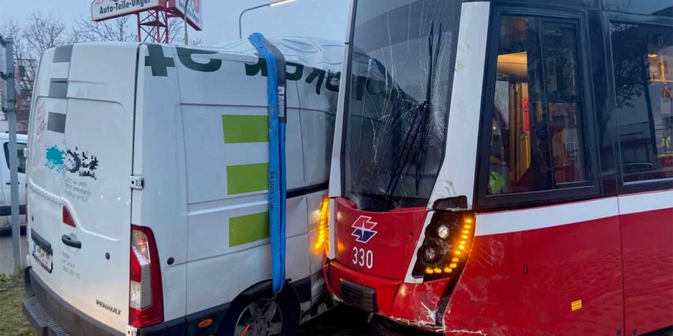 Das Fahrzeug wird dabei gegen einen Mast einer Ampelanlage gedrückt. Die Hintergründe des Unfalls sind noch unklar.Durch den Zusammenstoß wurde das Lieferfahrzeug gegen einen Masten einer Signalanlage gedrückt und knickte diesen dabei um.
