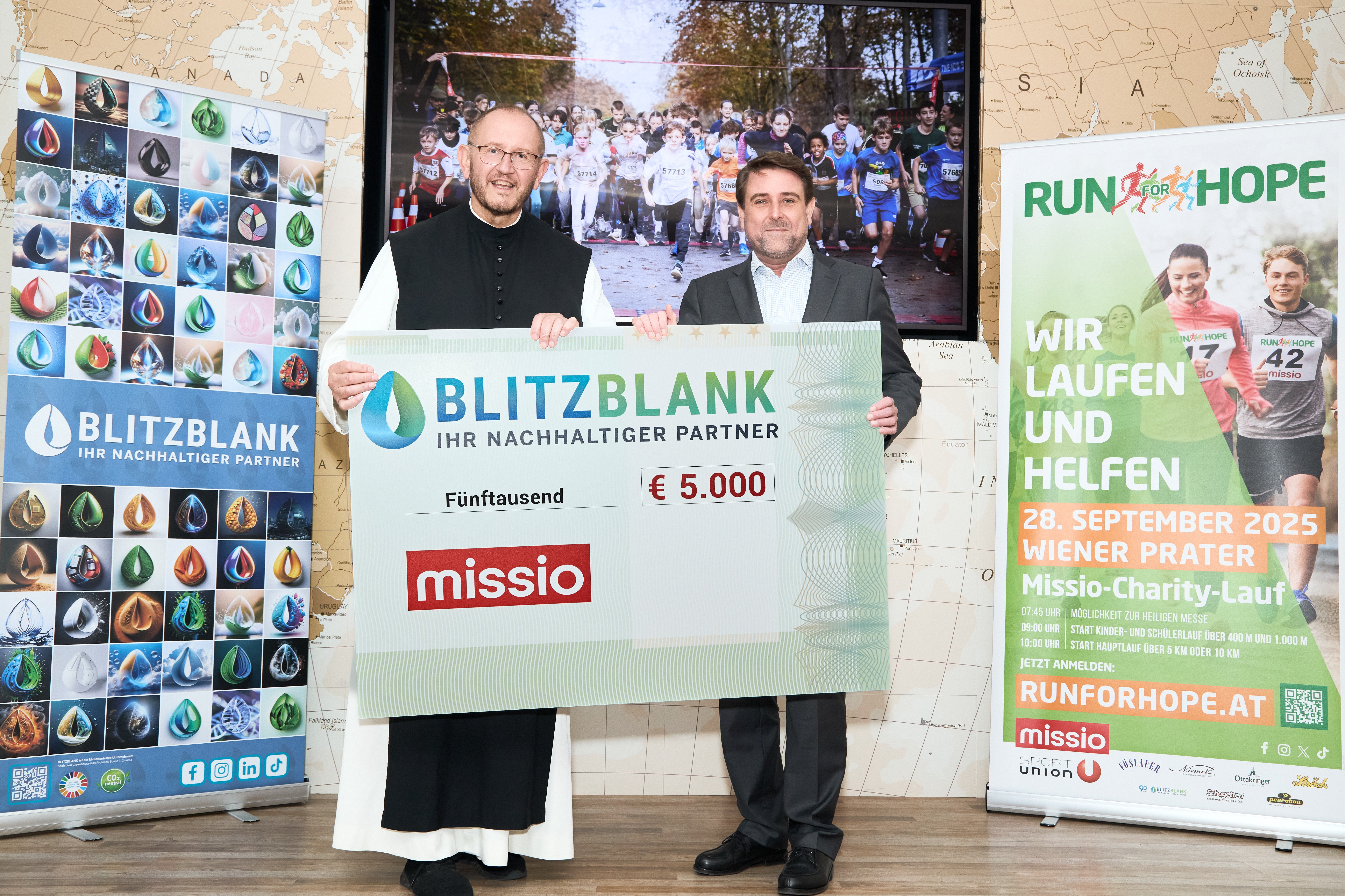 Die Summe von 25.000 Euro setzte sich aus 10.000 Euro Startgeldern und rund 15.000 Euro an Spenden für Missio-Läuferinnen und -Läufer zusammen. Einen besonderen Beitrag leistete das Reinigungsunternehmen BLITZBLANK. Geschäftsführer Mario Reichel überreichte Pater Wallner persönlich einen Scheck über 5.000 Euro. "Wir freuen uns, einen wesentlichen Beitrag an dem Hoffnungslauf geleistet zu haben“, erklärte Reichel. Die Initiative unterstützte er aus Überzeugung. "Zuversicht und Solidarität sind uns ein Herzensanliegen", sagte der Unternehmer.