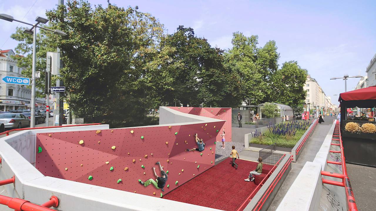 Als ein Highlight der Umgestaltung wird bei der Unterführung der Gudrunpassage eine 50 Meter lange Boulderwand errichtet. Sie wird im Außenbereich gleichzeitig auch als Stützmauer fungieren. Die Kletterwand ist zwischen 2,7 und 4,5 Meter hoch und soll bis zu 30 Kletterbegeisterten gleichzeitig Platz bieten. Selbstverständlich wird am Fuß der Kletterwand auch ein Fallschutzboden verlegt.