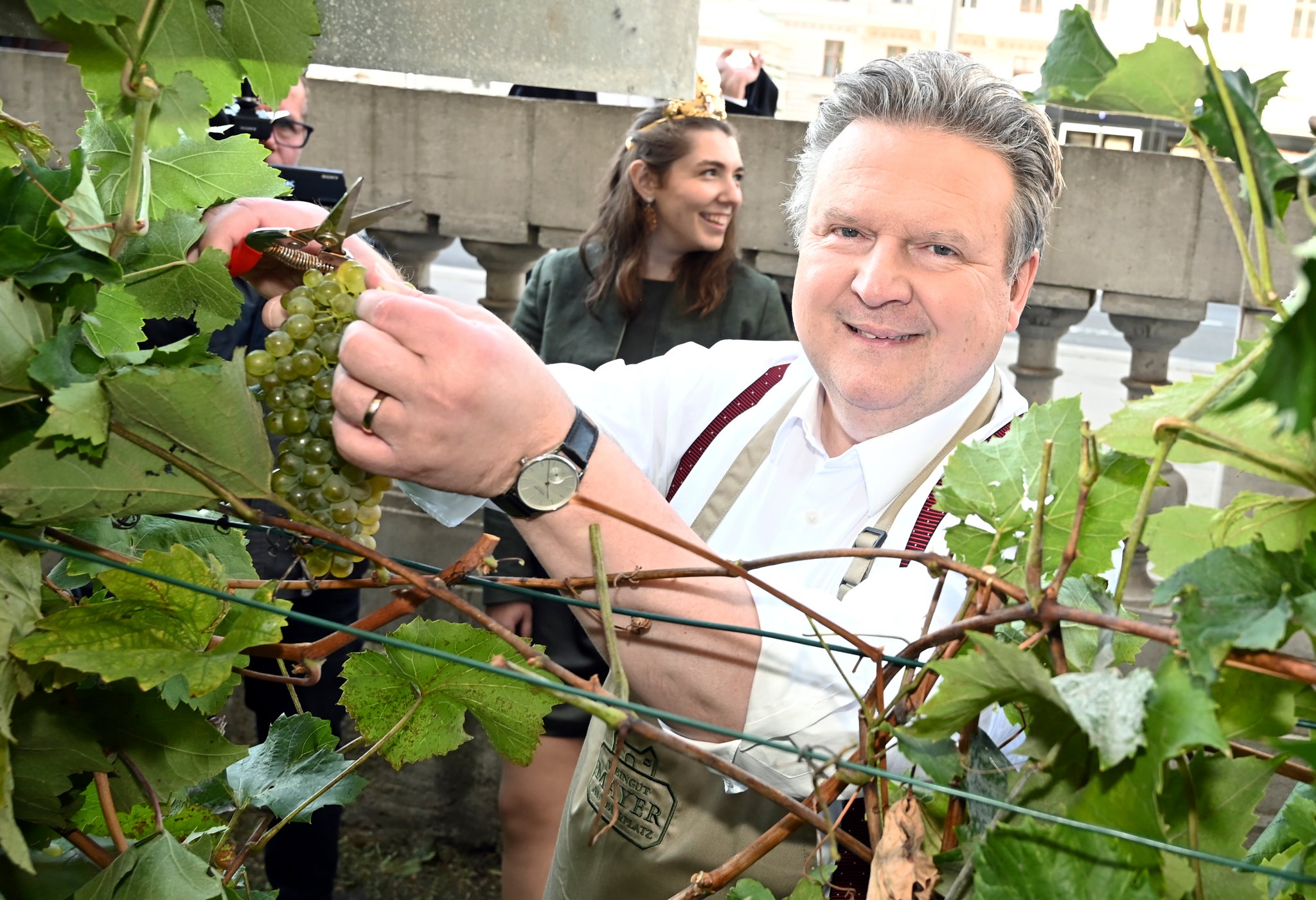 Wiens Bürgermeister Michael Ludwig (SPÖ) hat heute bei der traditionellen Weinlese am Schwarzenbergplatz die heurige Weinernte in Wien eingeläutet. Ludwig schnitt dabei mit einer Schere ausgestattet und einer Schürze bekleidet einige Reben von den rund 70 Rebstöcken im kleinstem Weingarten der Stadt. Musikalisch umrahmt wurde die innerstädtische Weinlese von einer Kapelle des Musikvereins Leopoldsdorf im Marchfelde in Niederösterreich.