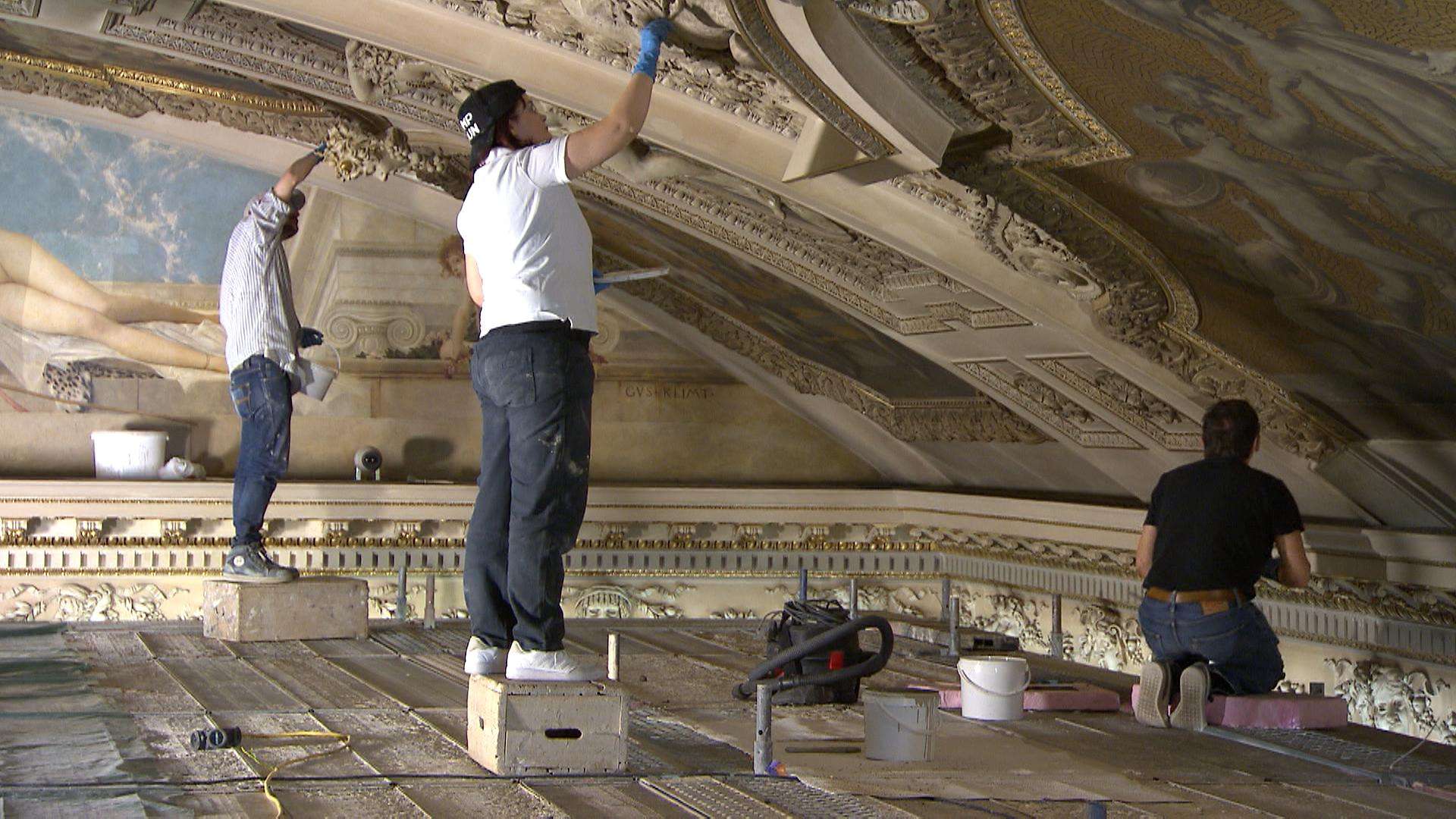Im Burgtheater können Besucherinnen und Besucher derzeit ein Kunstereignis der besonderen Art erleben. Die aufwendig restaurierten Deckengemälde etwa von Gustav Klimt sind nun aus unmittelbarer Nähe zugänglich. Ein begehbares Gerüst führt direkt unter die farbenprächtigen Werke.