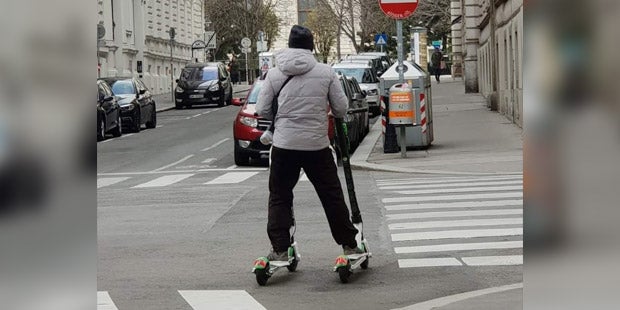 Wien. Diese Variante kannten viele noch nicht: Am Freitagnachmittag fiel ein besonders geschickter E-Scooter-Fahrer bei einem Balance-Akt mit zwei Fahrgeräten auf. Dabei dürfte es sich um einen geübten Scooter-Einsammler handeln, wie im Netz spekuliert wird. Sie verdienen sich mit dem Zusammentragen des fahrbaren Untersatzes ein paar Euro dazu. Laden sie die Geräte auch auf, nennt man sie "Juicer".