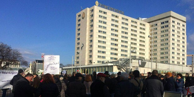 Hundert Gegner formierten sich vor dem Eislauf-Verein am Heumarkt.