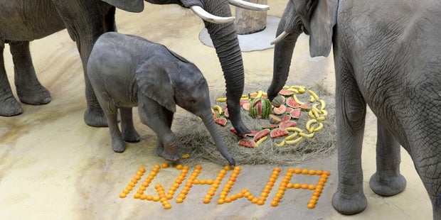 "Happy Birthday, Iqhwa!" tönte es am Donnerstag durch den Elefantenpark des Wiener Tiergartens Schönbrunn, als das "Geburtstagskind" samt Mutter Tonga und Halbschwester Mongu durch das Tor kam. Die Pfleger hatten dem Elefantenmädchen zum heutigen ersten Geburtstag eine "elefantöse" Torte mit Heu und Obst kreiert.