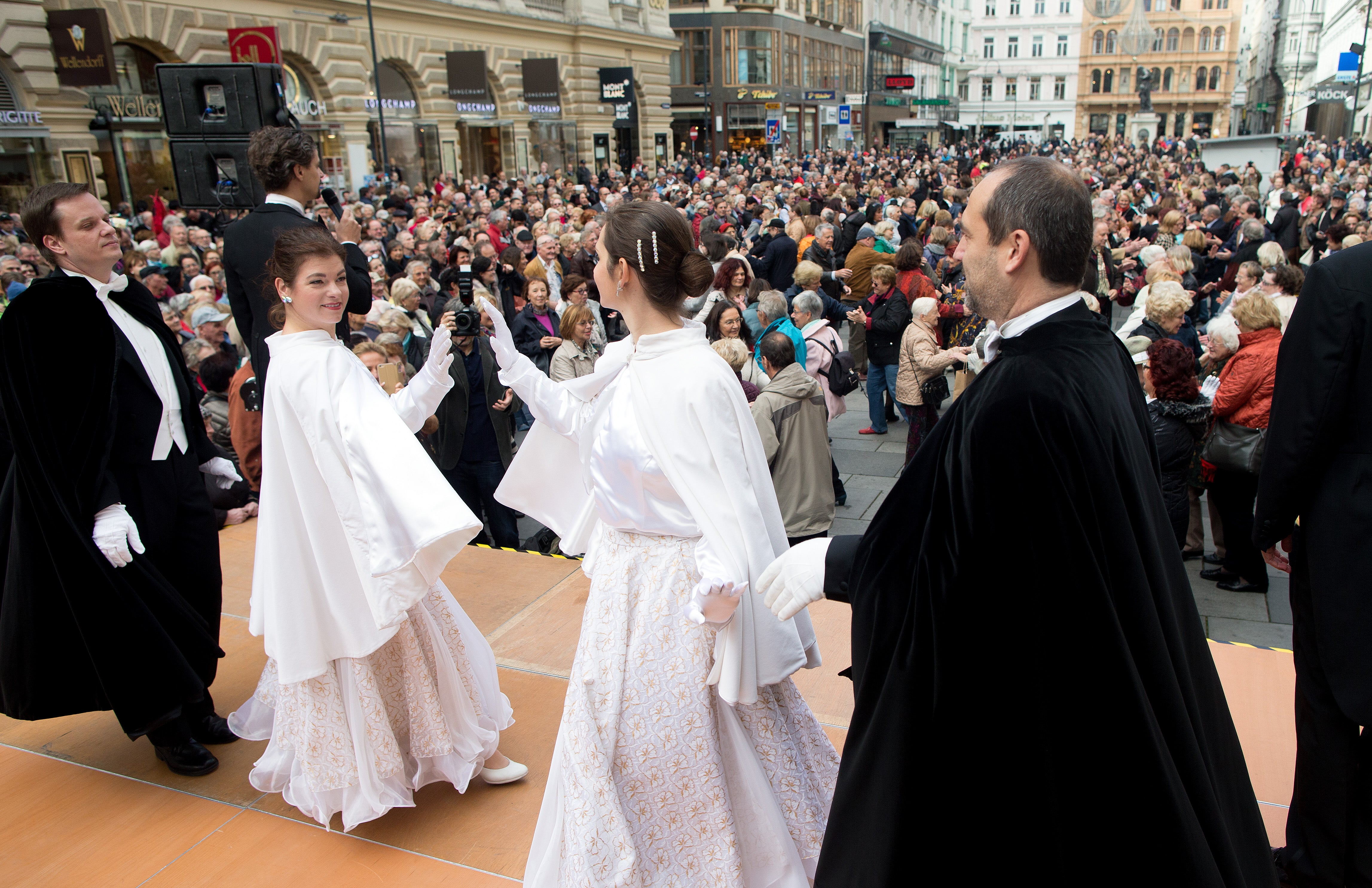 Die Wiener Tanzschulen laden zu Faschingsbeginn Passanten und Touristen zur Quadrille am Graben.