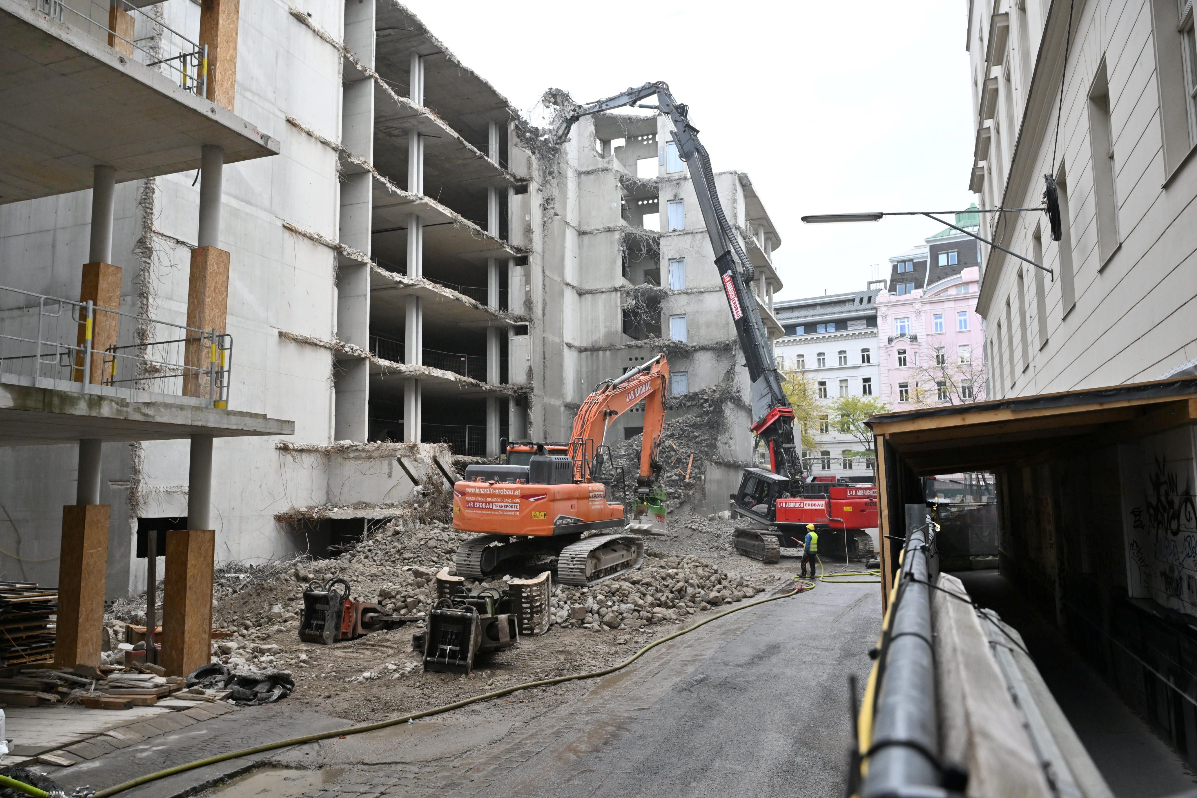 Zwei Jahre lang stand das Luxus-Kaufhausprojekt der Signa "Lamarr" unfertig auf der Mariahilfer Straße. Mittlerweile ist der Abriss durch den neuen Eigentümer im vollen Gange, und dieser reduziert das Gebäude runter bis auf den ersten Stock, ehe neu gebaut wird.