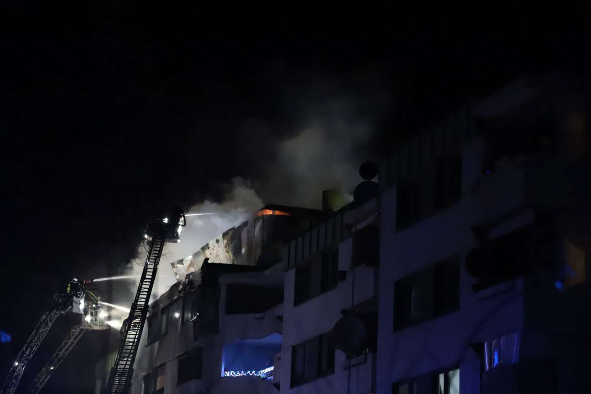 Die Einsatzkräfte kämpften lange Zeit damit, das Feuer unter Kontrolle zu bringen. Laut Augenzeugenberichten flogen immer wieder brennende Gebäudeteile auf die Wiese vor dem Gebäude.