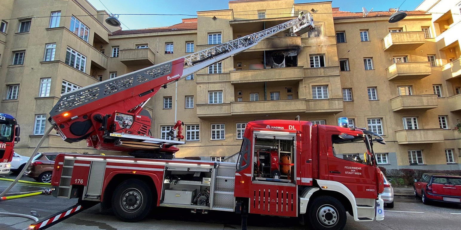 Beim Eintreffen der Berufsfeuerwehr drangen Rauch und Flammen aus den Fenstern der Wohnung im zweiten Stock eines sechsstöckigen Gebäudes. Der Balkon stand ebenfalls in Brand. Es galt ein Übergreifen auf angrenzende Bereiche zu verhindern sowie das Feuer von außen zu bekämpfen. Zugleich drang ein Trupp mit einer weiteren Löschleitung unter Atemschutz über das Stiegenhaus in die Wohnung vor, berichtete die Feuerwehr.