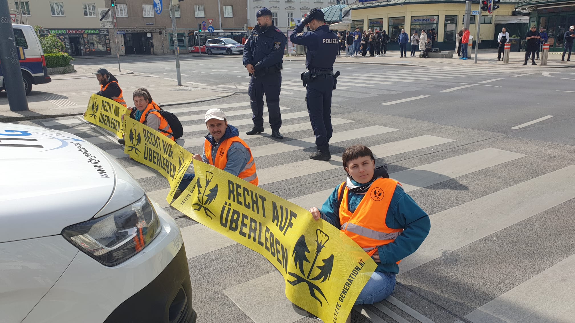 Sehr gesittet im Vergleich zu vergangenen Sitzdemos der Klimaktivisten lief die heutige Demo gegen 10.30 Uhr beim Naschmarkt ab. Demonstranten setzten sich auf die Zenbrastreifen der Linken Wienzeile vor der Secession und dem Getreidemarkt ums Eck und stoppten den Verkehr auf der Zweierlinie und der Friedrichstraße bis zurück zum Ring und über den Karlsplatz.